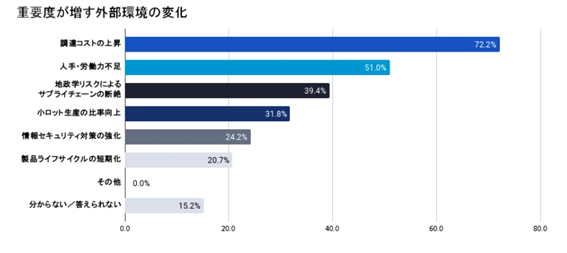2024年7月のキャディ株式会社の「製造業の調達実態調査」によると今後の製造業で重要度が増す外部環境の変化やリスクとしてこれまで1位だった人手・労働力不足を抑えて「調達コストの上昇(72.2%)」が圧倒的な1位となっております。これはアメリカと中国の貿易摩擦などの影響もあり資源調達がリスク要因になっていることがうかがえます。