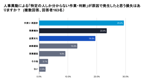 キャディ株式会社のキャディ調査レポート 属人化リスクとAI活用編】では『製造業従事者の98%が所属する部署において、「特定の人しか分からない作業・判断」が存在すると回答』されており、『「特定の人しか分からない作業・判断」が原因の損失はありますか』との質問で「ない」との回答はわずか2.3%です。最も多いのは「手戻り・再計算」の29.4%、品質劣化も19.5%となっており、