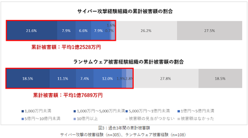 セキュリティ対策ソフト大手のトレンドマイクが2023年に発表した「サイバー攻撃による法人組織の被害状況調査」では、累計被害額の平均は1億2528万円となっていて、ランサムウェア攻撃では平均1億7689万円となっています。